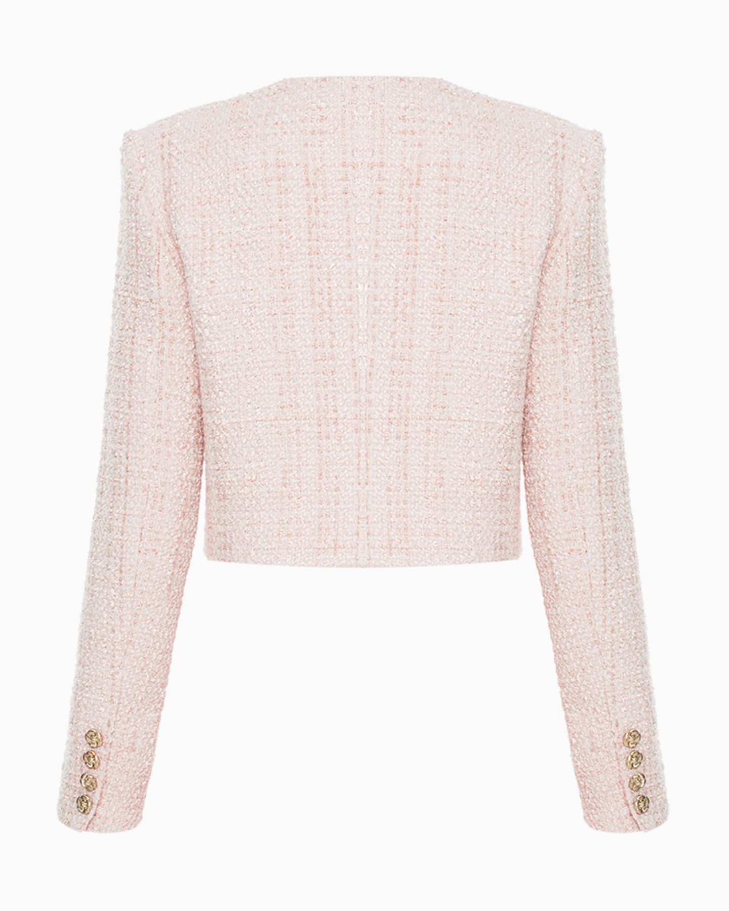 Гармония стиля и современной элегантности. Премиальный твид придает изделию лёгкий блеск и изысканность, а укороченная длина подчеркивает талию, создавая женственный силуэт. Эксклюзивные пуговицы в виде бутонов роз придают роскошь и утонченность.