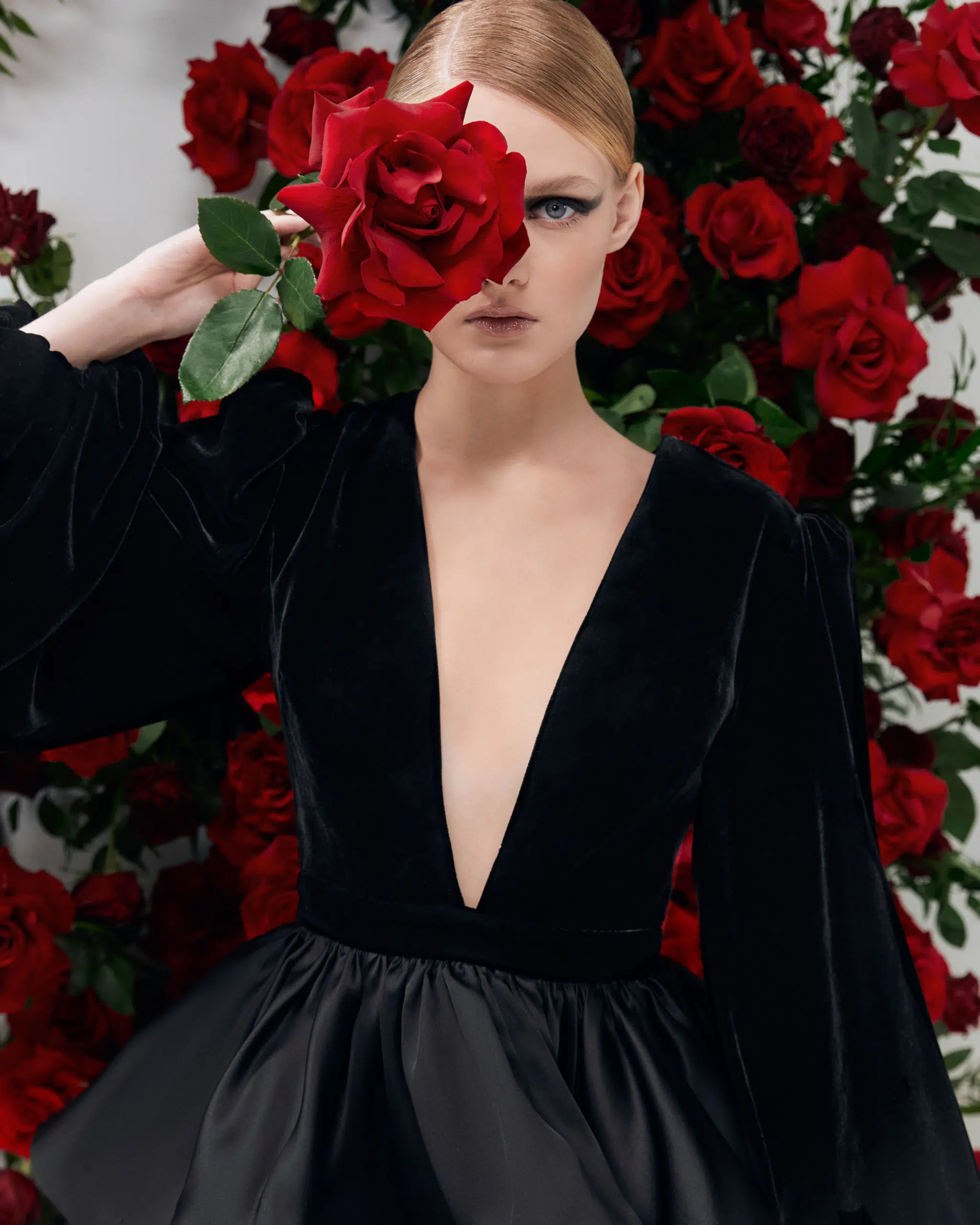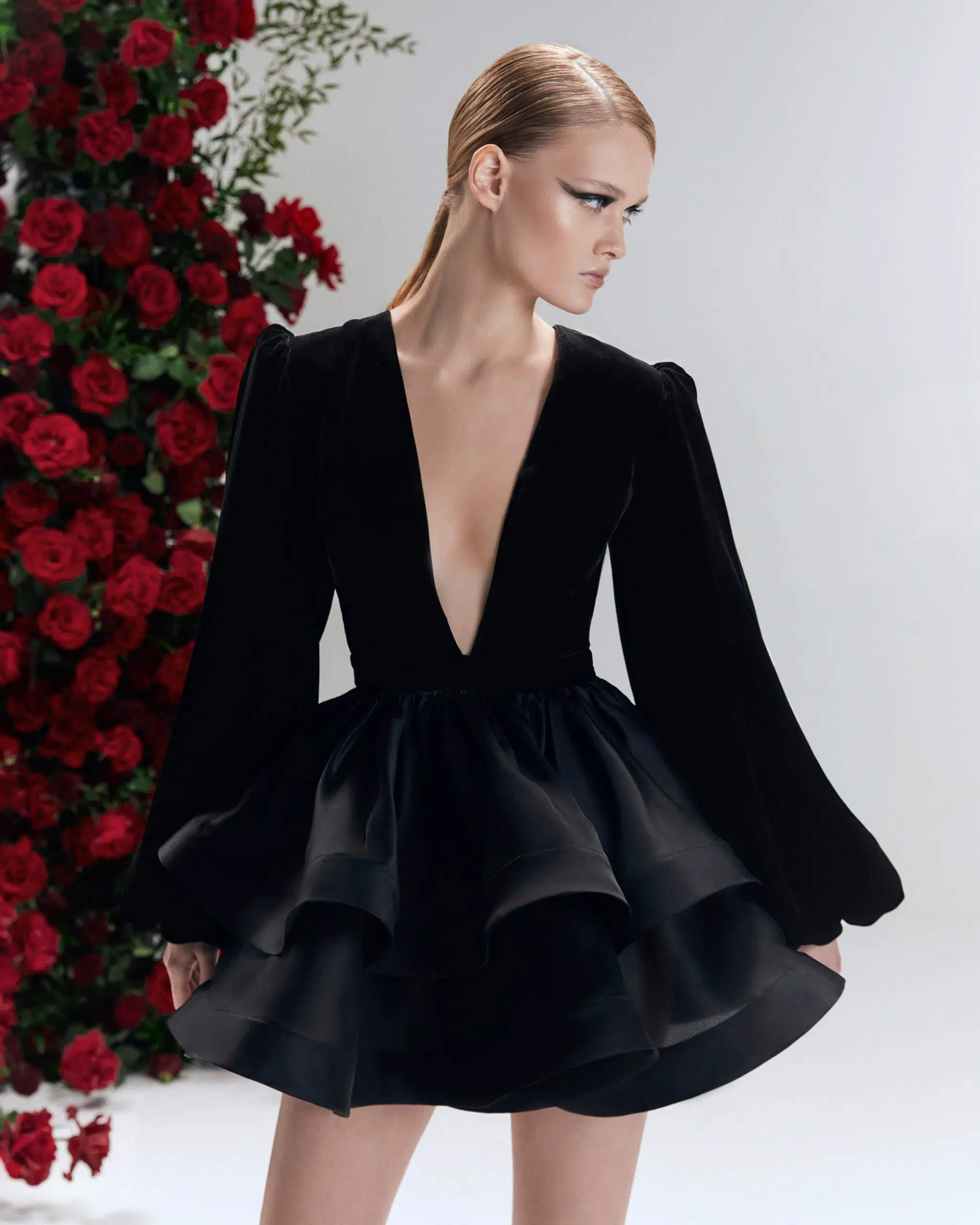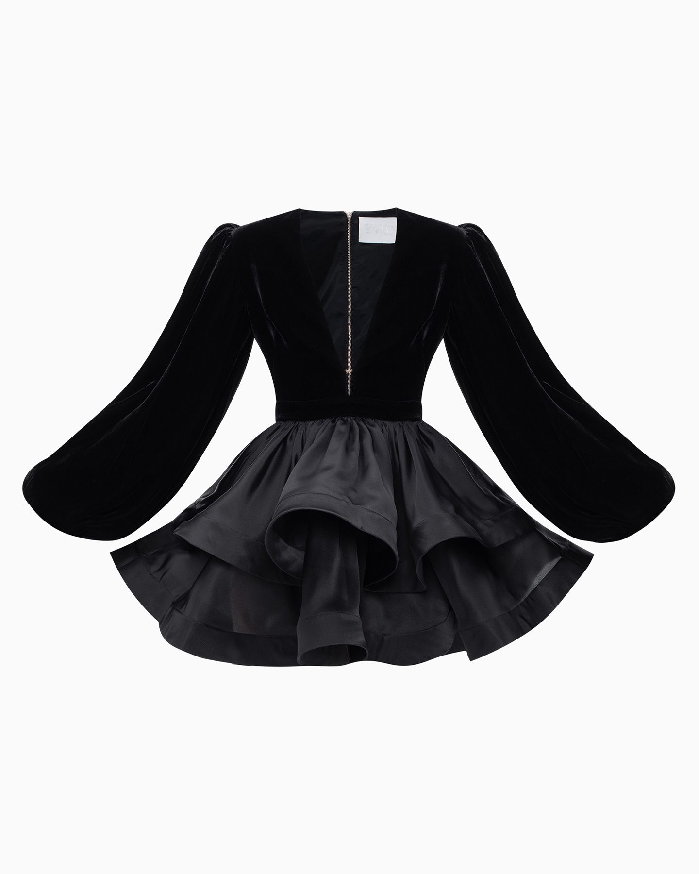 Наше поистине легендарное платье в новом исполнении. Верхняя часть выполнена из натурального бархата, а нижняя из шелковой органзы. Очень глубокий, но при этом максимально комфортный вырез на декольте, у которого предусмотрена петелька, на случай если вы захотите отрегулировать глубину. Две пышные юбки, с регилином внутри изящно подчеркнут вашу сексуальность и женственность.