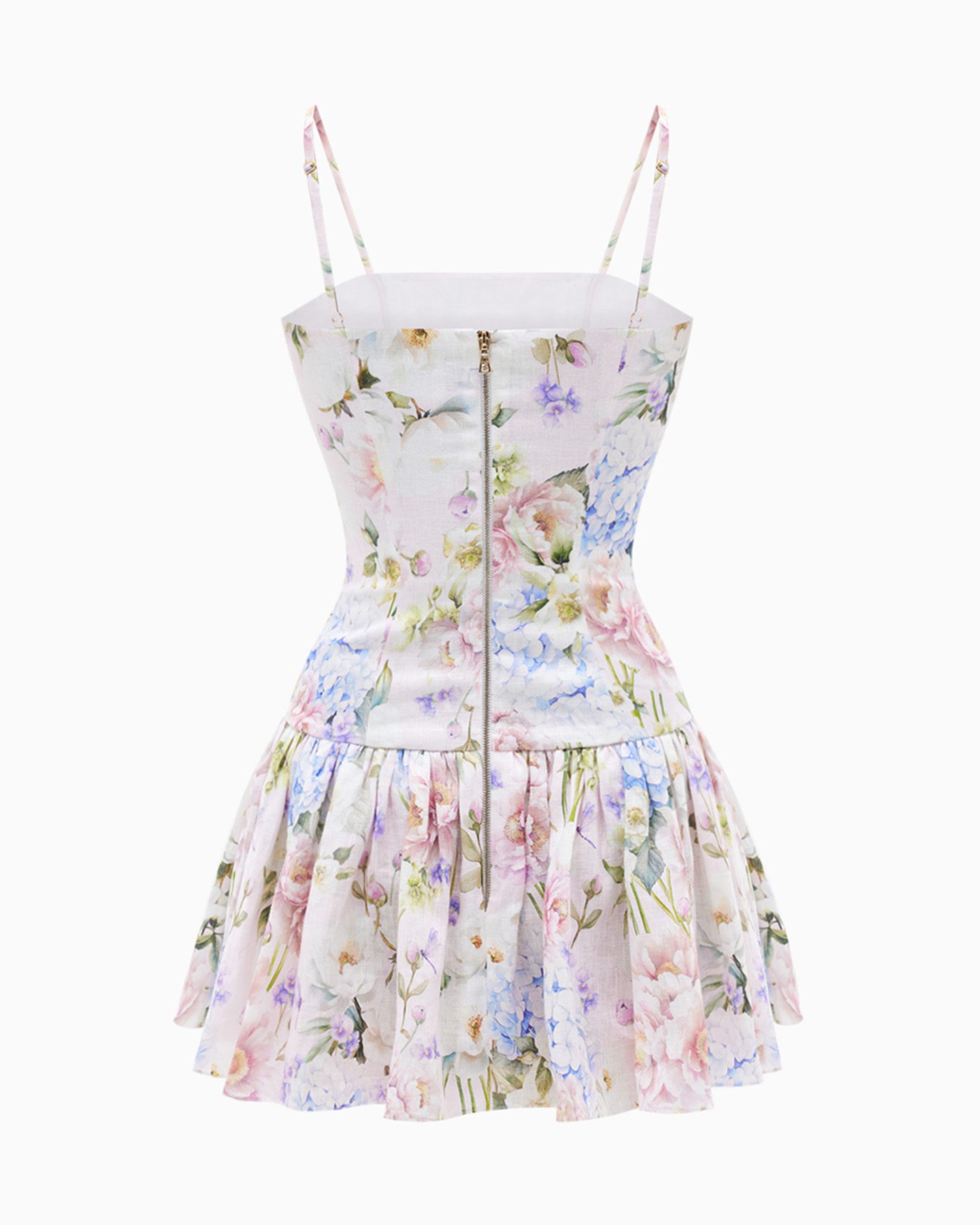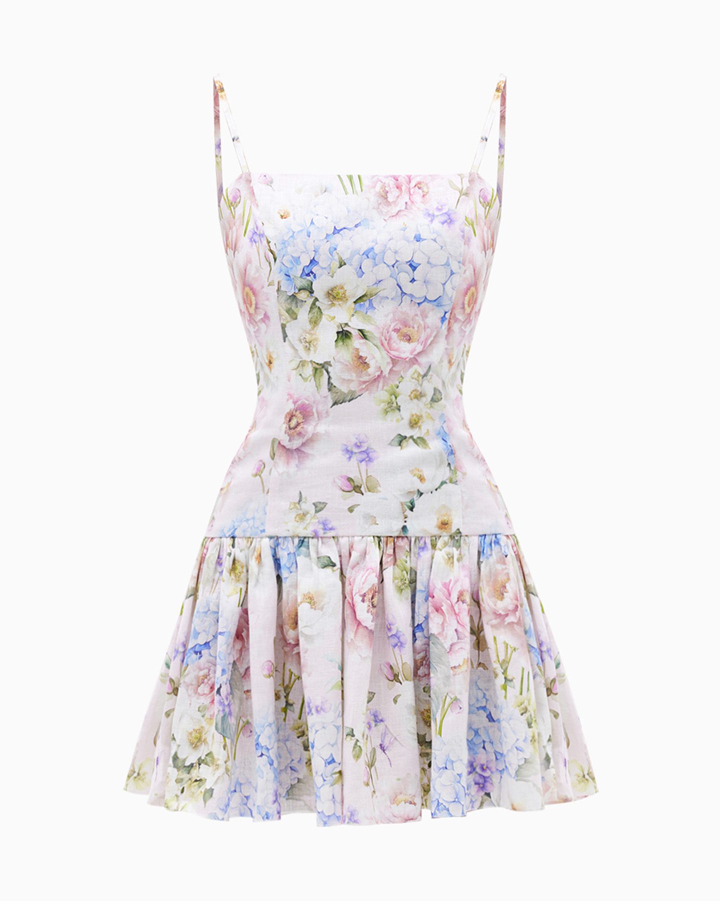 Нежный цветочный принт, акцент на талии, тонкие бретели и расклешённая юбка формируют утончённый силуэт, делая эту модель уместной как для повседневных прогулок, так и для особых случаев.