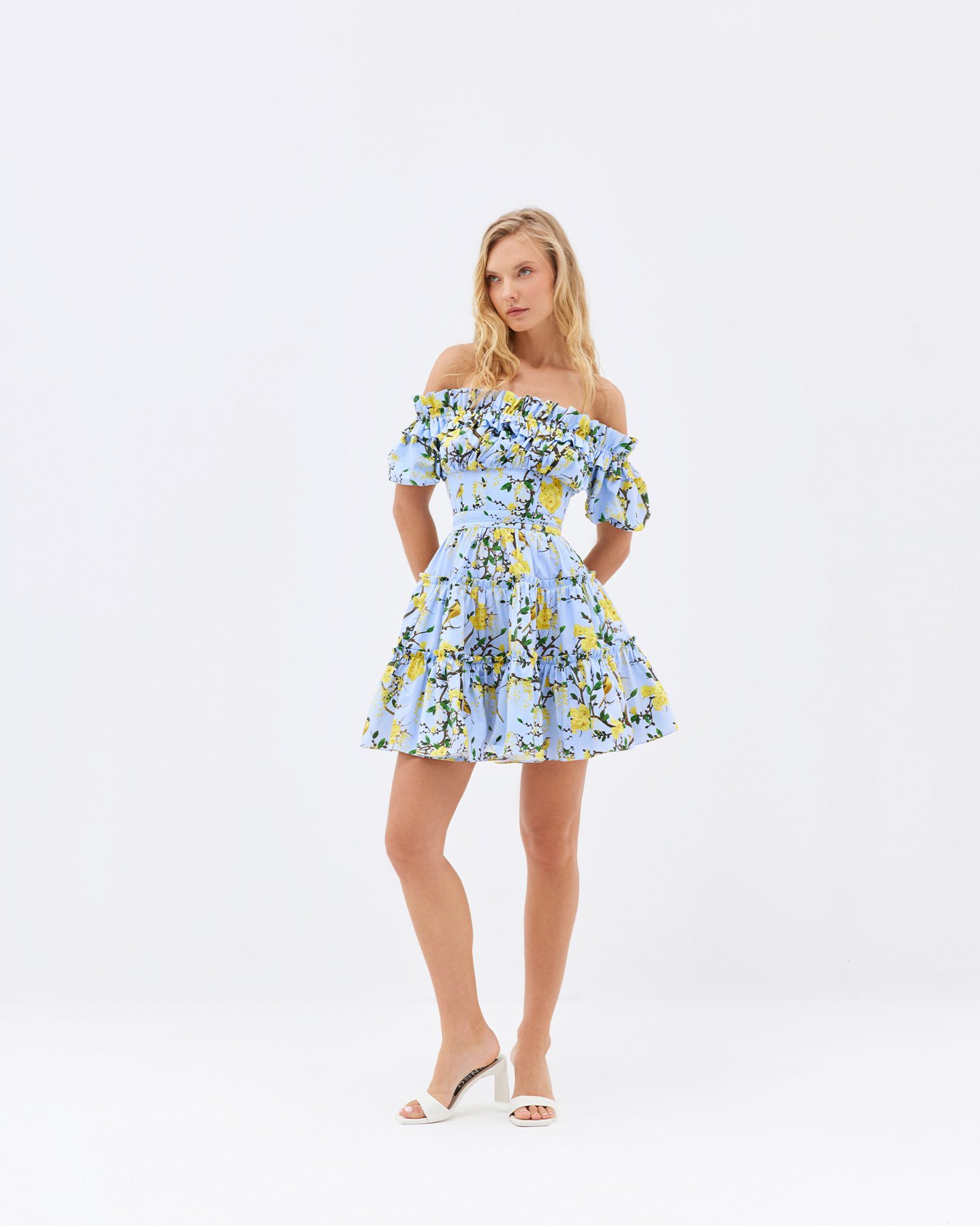 Идеальная длина мини и корсет ручной работы создают изящный силуэт, эффектно подчеркивая талию. Объёмная драпировка на рукавах и груди добавляет женственности, а уникальный принт с мотивами цветущих садов Южной Африки добавляет вашему образу изюминку и делает его незабываемым.