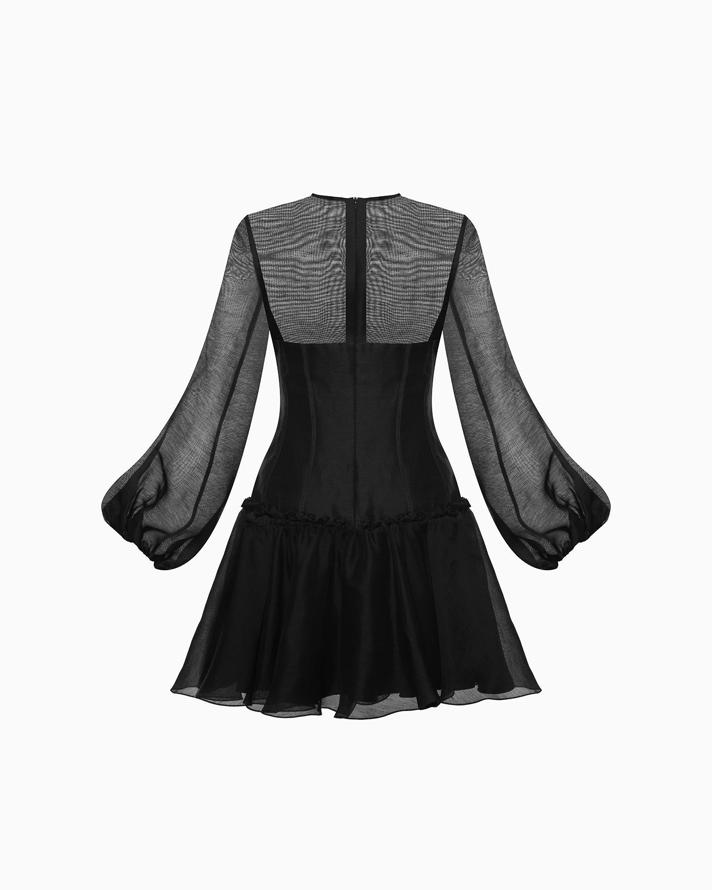Это мини-платье из премиального льнa-шёлка в чёрном цвете — воплощение утончённости и загадочности. Мини-длина и облегающий силуэт подчёркивают женственные линии фигуры, а элегантные сборки на подоле добавляют образу динамичности. Полупрозрачный чёрный шёлк нежно обтекает тело, создавая ощущение лёгкости и утончённой элегантности.