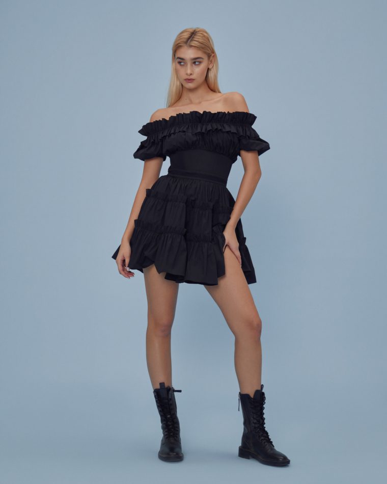 Платье, приковывающее к себе все взгляды. Драпированный ассиметричный лиф ручной работы, пышная юбка с регилином и эксклюзивный принт придают этому наряду шарм и магическую привлекательность. Особую индивидуальность платью добавляет регулируемая шнуровка на талии, создающая эффектную силуэтную линию и добавляя вашему образу женственности и интригующей сексуальности.