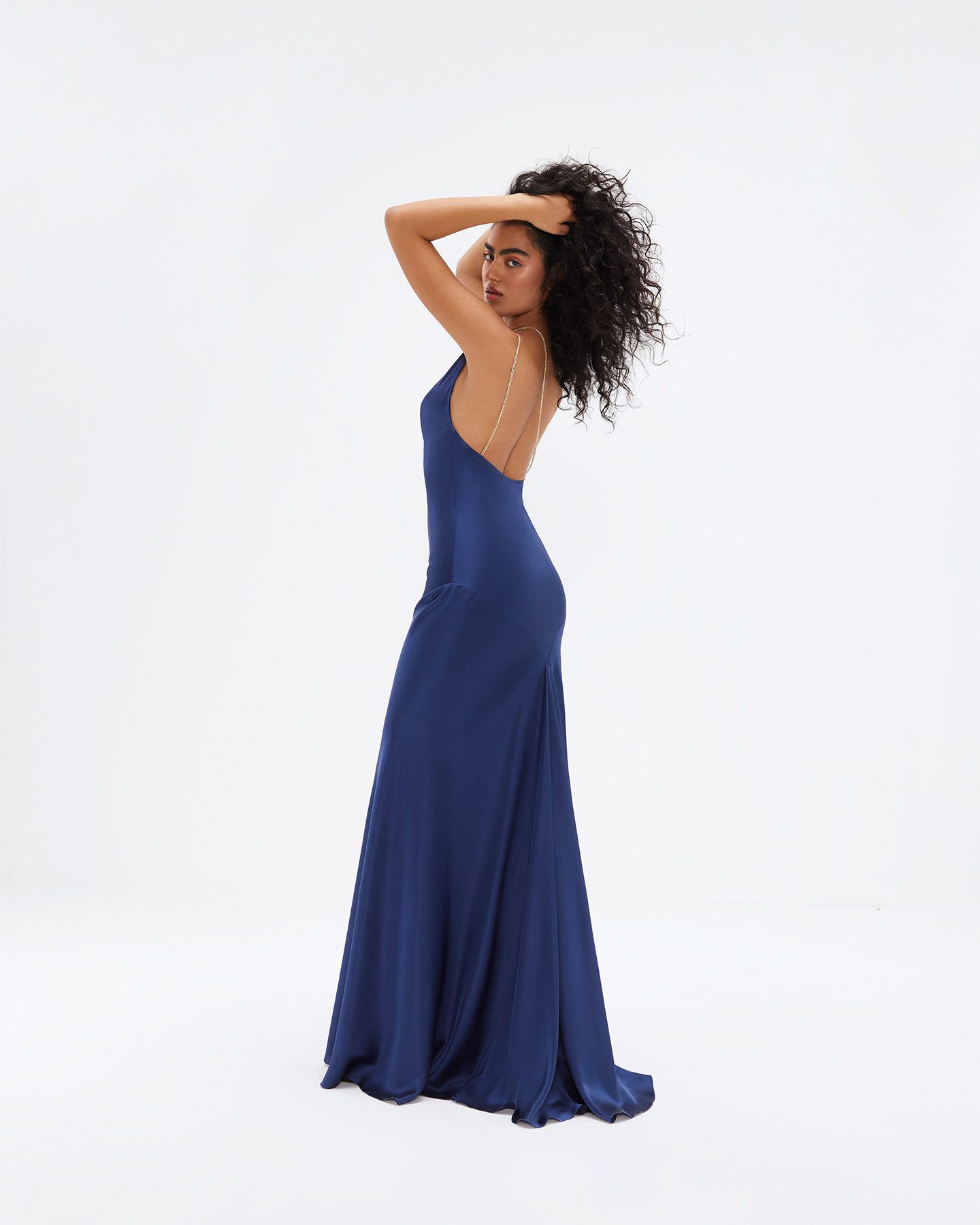 Роскошное платье из 100% шёлка, который невесом на коже и красиво струится во время танца. Благодаря тому, что оно скроено по косой, ткань садится точно по фигуре и полностью повторяет изгибы вашего тела. Оно будто обнимает вас со всех сторон и сливается с вами в единое целое. Цепочки из кристаллов Сваровски добавляют сияния коже, а качелька спереди создаёт женственные линии декольте. В этом платье вы точно станете звездой любой вечеринки.