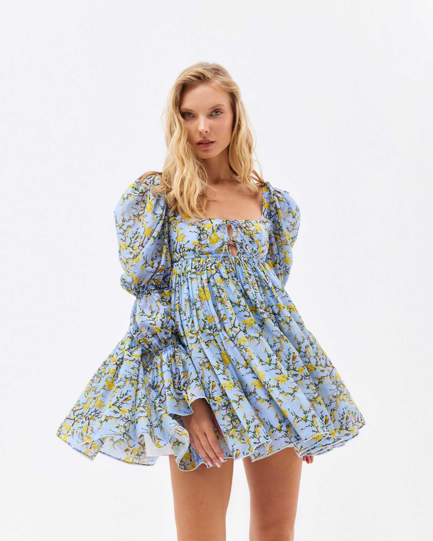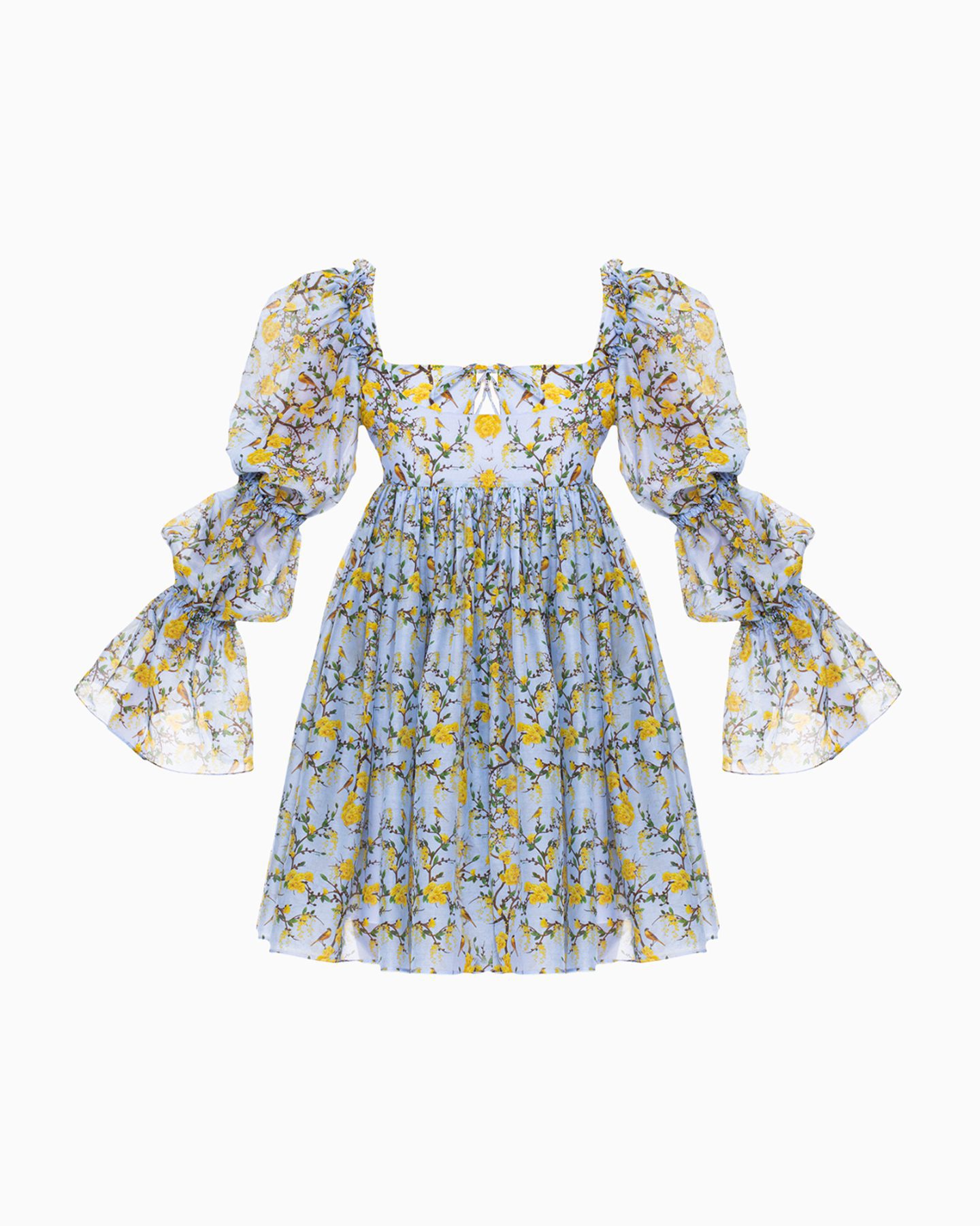 Идеальный выбор для романтичной прогулки в жаркий день. Воздушный приятный к телу шёлковый батист в сочетании с уникальным принтом, вдохновленным яркими красками африканской природы, делает это платье абсолютно незаменимым. Изысканные детали в виде рюшей по краю рукавов и юбки, завязочек и резинок в рукавах добавляют платью игривости и шарма. Куда бы Вы ни направлялись, в этом платье Вы будете безупречны в любой ситуации.