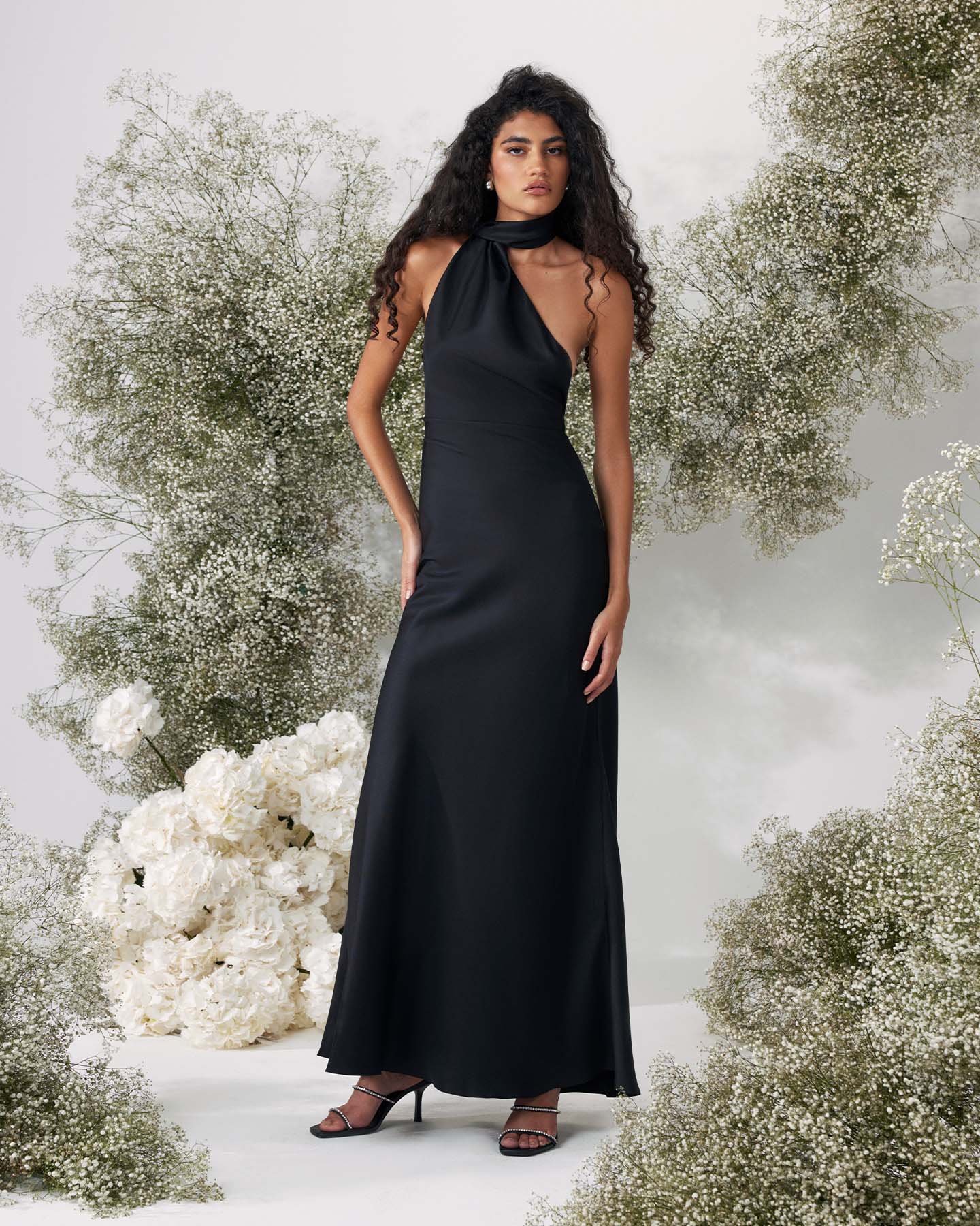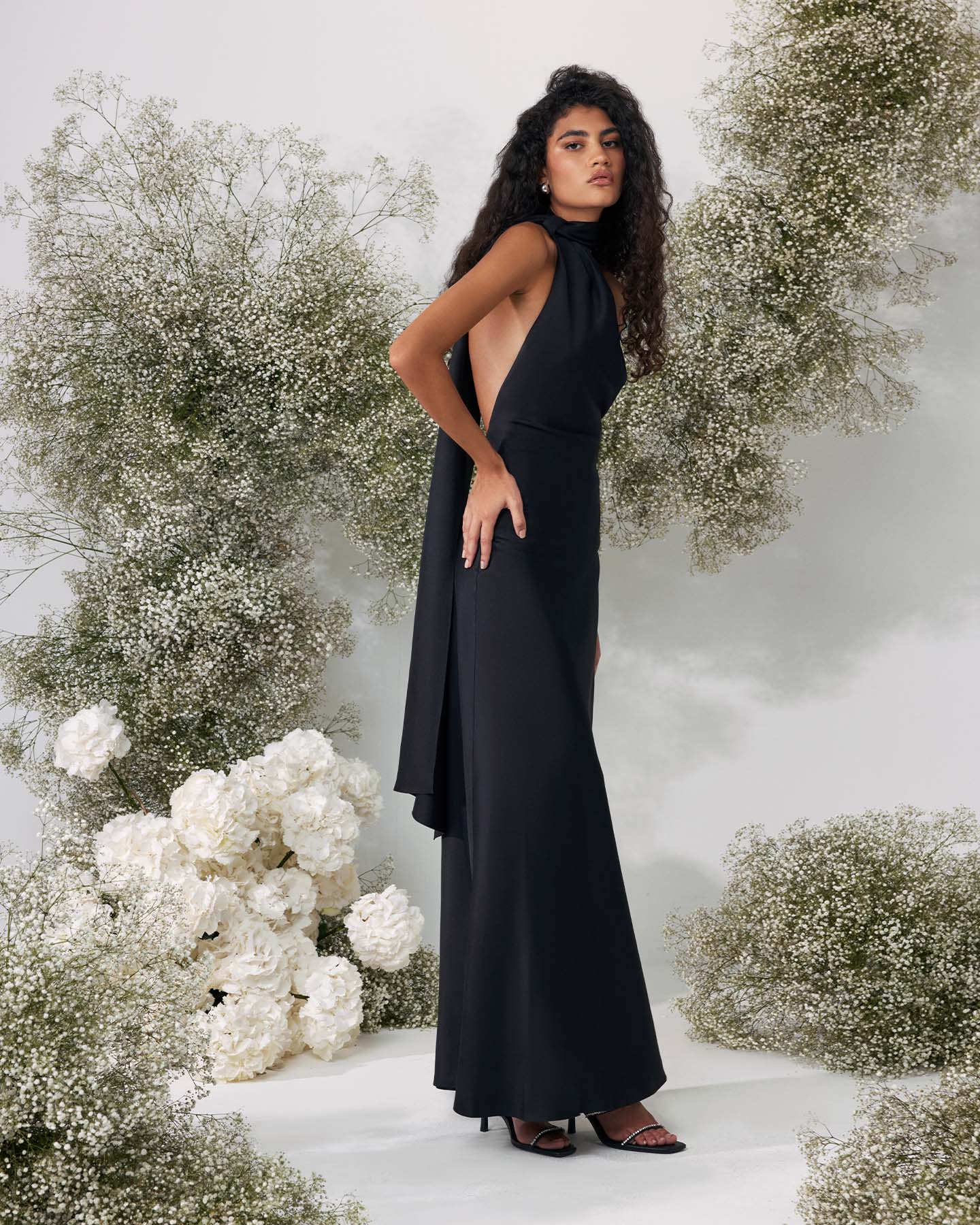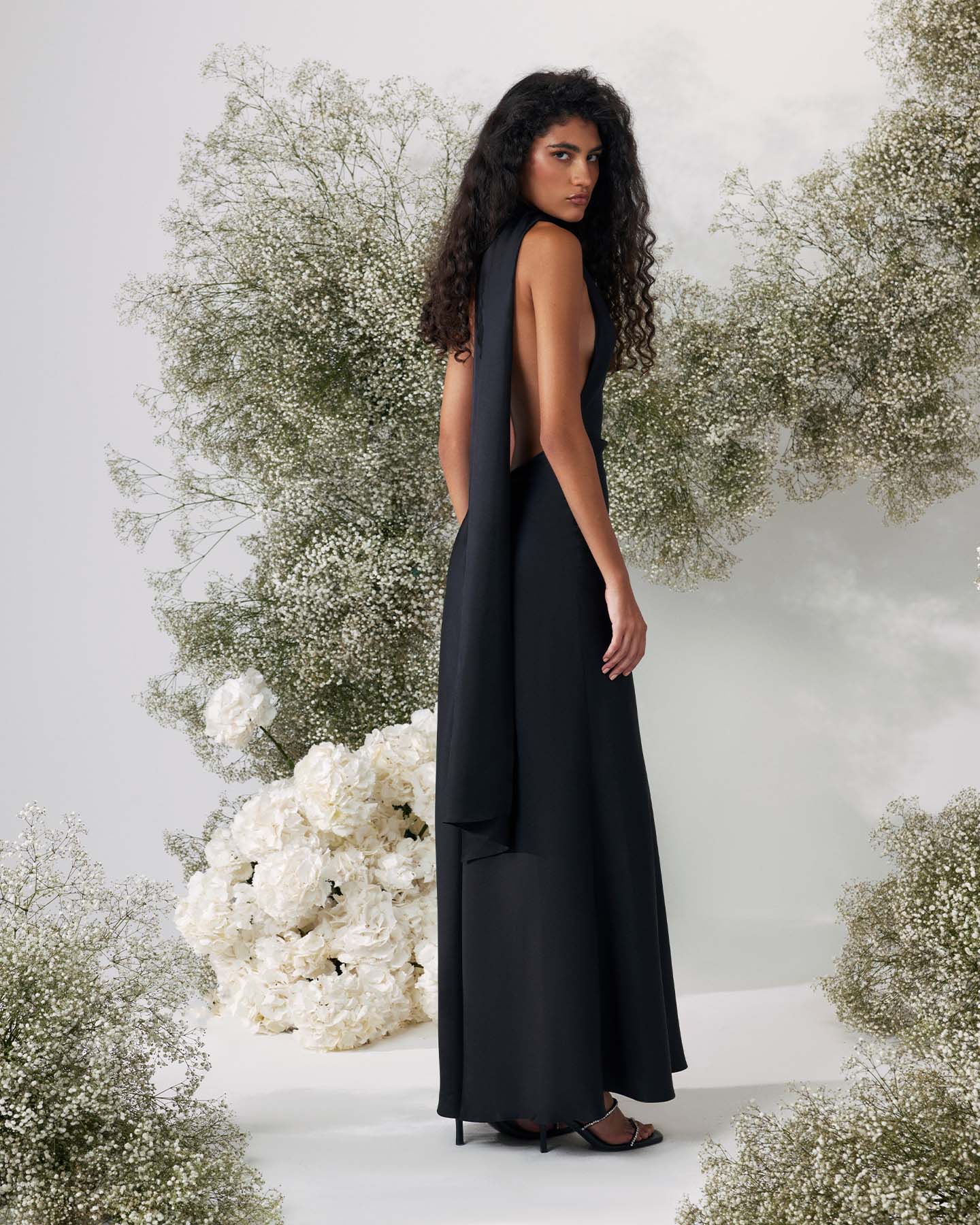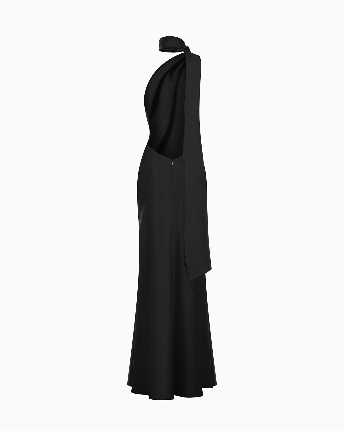 Воплощение изысканности и таинственного очарования. Чёрный шёлк плавно облегает фигуру, подчёркивая её утончённость, а открытая спина и шарф-горловина с шлейфом добавляют образу драматичности и элегантности. Идеальный выбор для особых событий, где вы хотите подчеркнуть свою индивидуальность и стиль