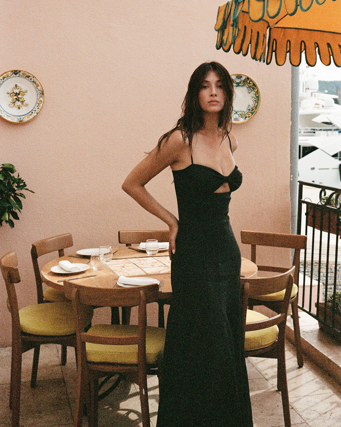 Приталенный крой и длина макси подчёркивают фигуру, создавая изящный женственный силуэт.