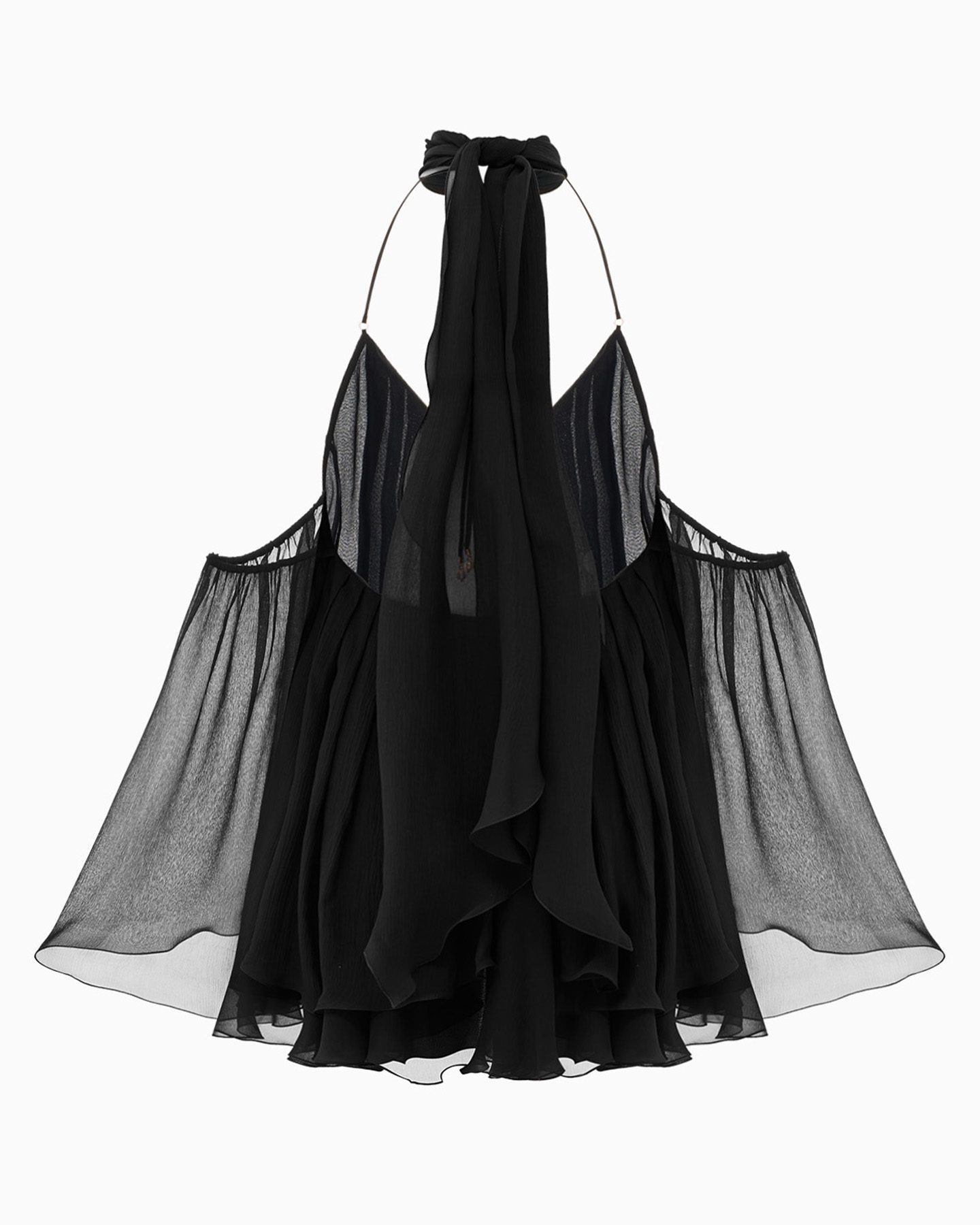 Воздушное платье с акцентной деталью на шее. Шелковый наряд сочетает в себе женственные нотки благодаря завязкам на спине, кисточкам на их концах и уникальному лифу ручной сборки. Дополните его любимой сумкой и не забудьте нанести парфюм с восточными нотами. Образ для загадочной девушки, оставляющей о себе неизгладимые воспоминания и исчезающей посреди гуляющей толпы в глубине экзотического Марокко. Будьте непредсказуемы и элегантны несмотря ни на что!