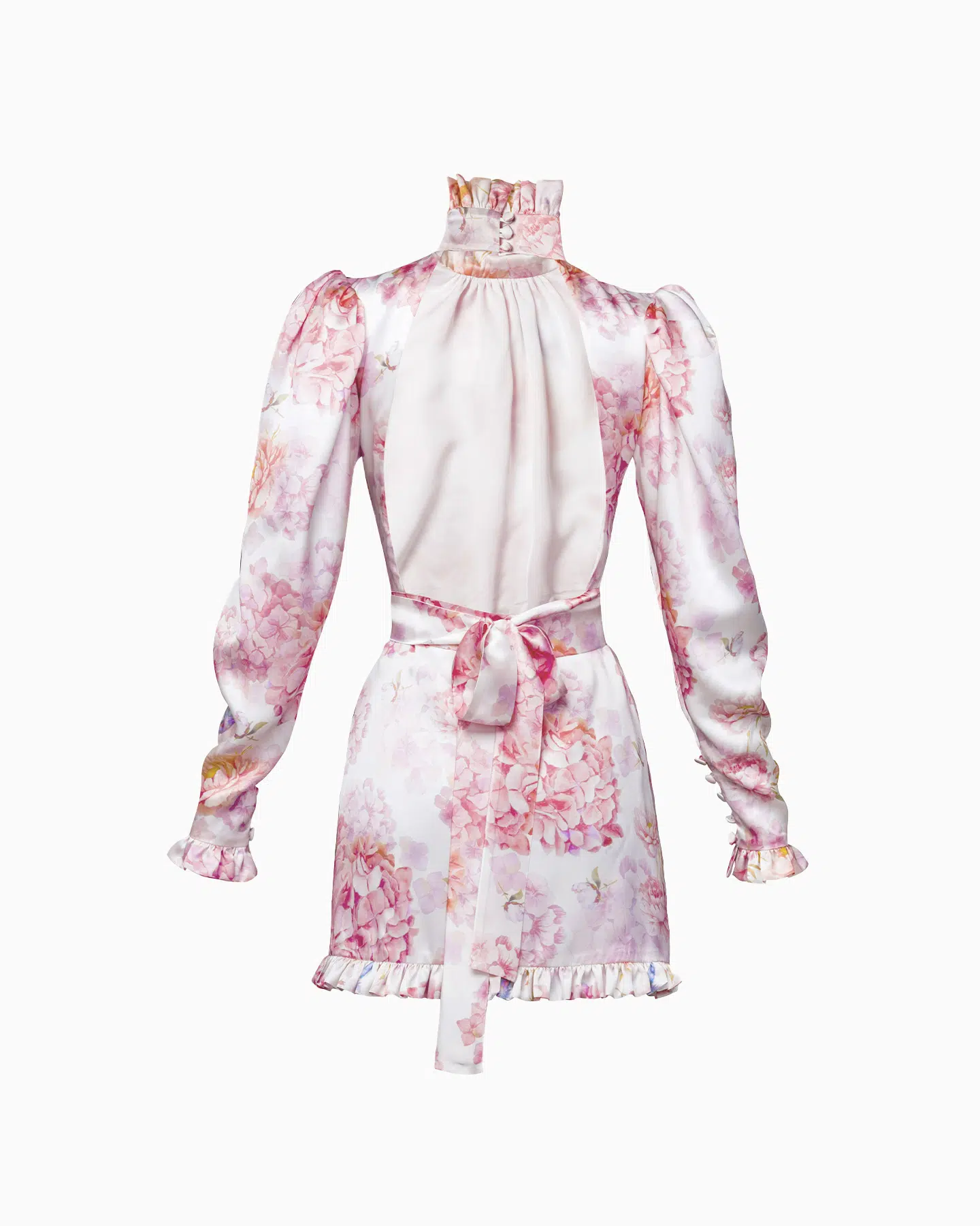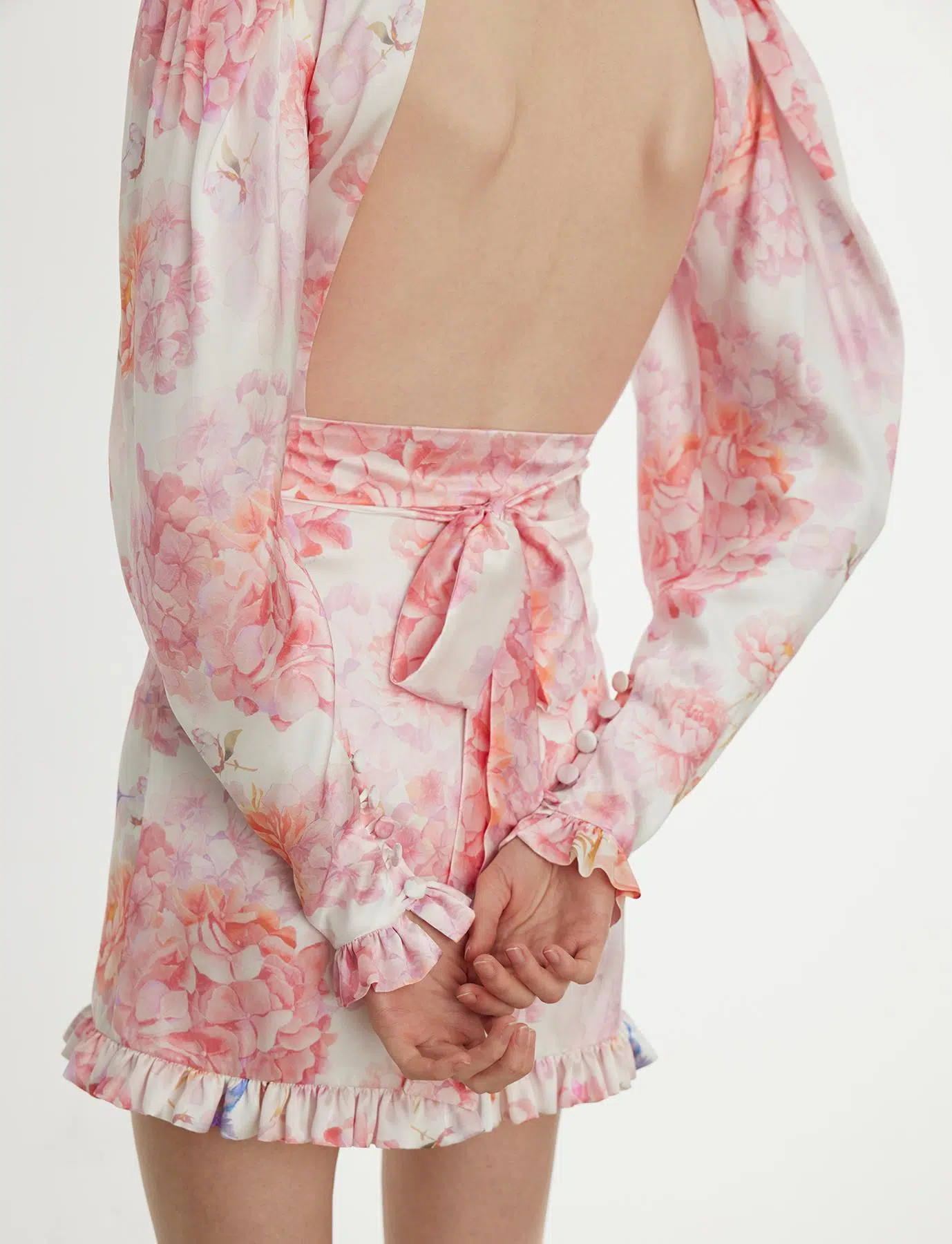 Если вы давно искали роскошную премиальную ткань, то вы её нашли. Это 100% итальянский шёлк. На ткань нанесён лимитированный принт, который вы не найдёте больше нигде. Это платье просто создано для особых мероприятий. В нём вы точно не останетесь незамеченной. Открытая спина, объемные рукава с рюшами и изящный акцент на талии. Всё это делает вас королевой любой вечеринки.