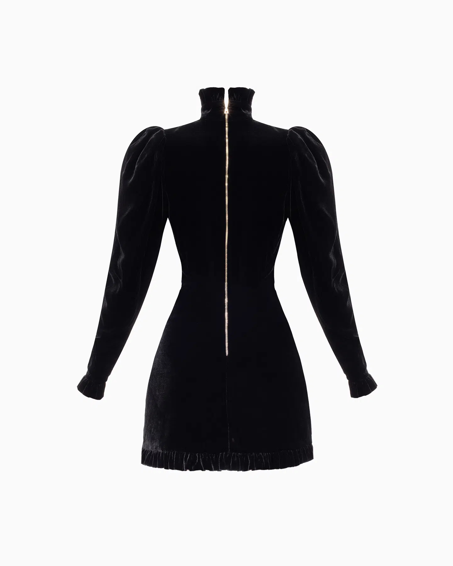 Наше signature платье в новом цвете midnight winter sky. Выполнено из натурального бархата и с закрытой спиной, чтобы вам было комфортно в прохладную погоду. Объемные рукава с рюшами и изящный акцент на талии – это платье просто создано для особых мероприятий. В нём вы точно не останетесь незамеченной.