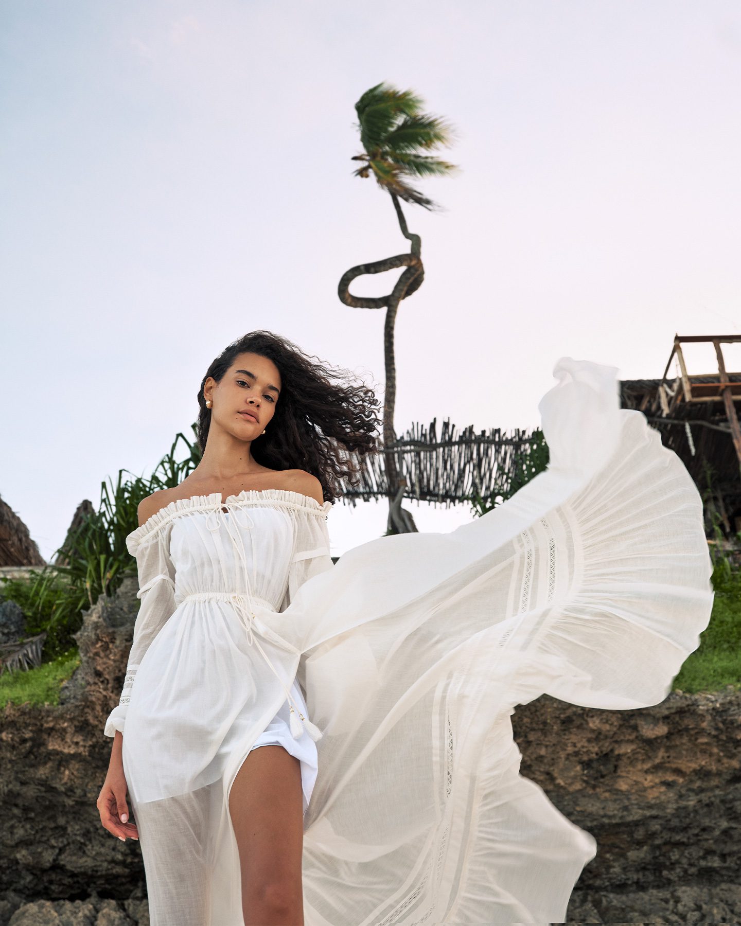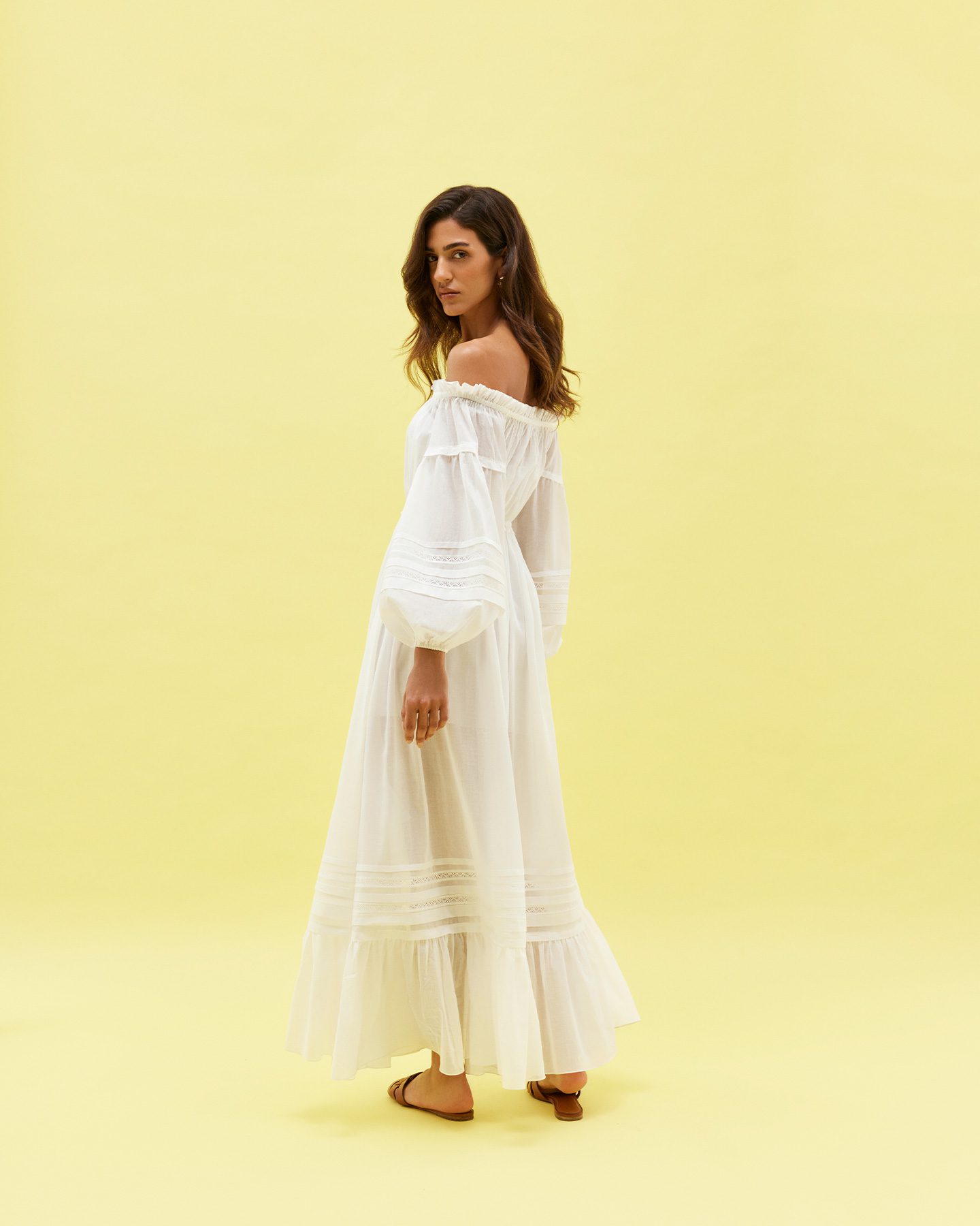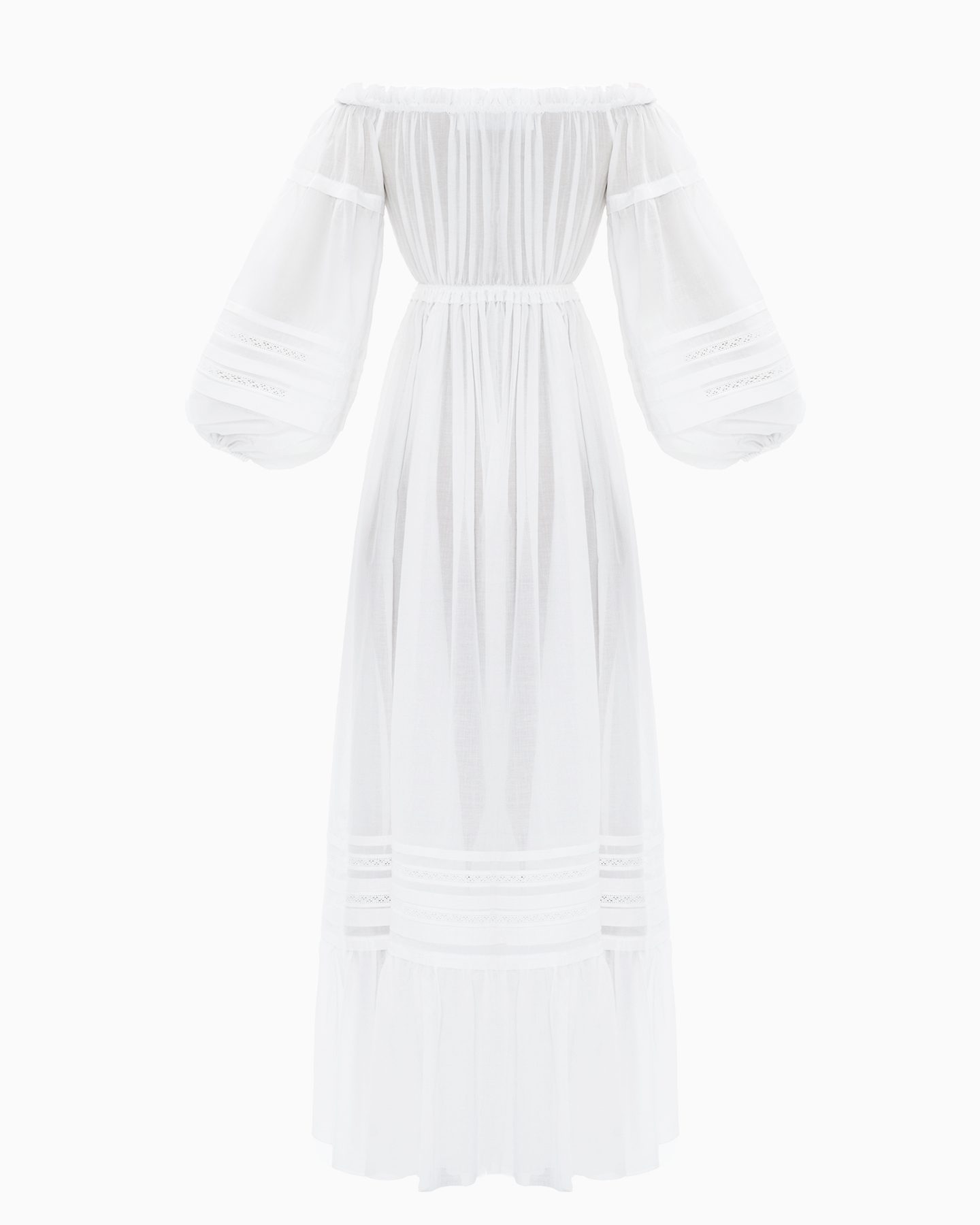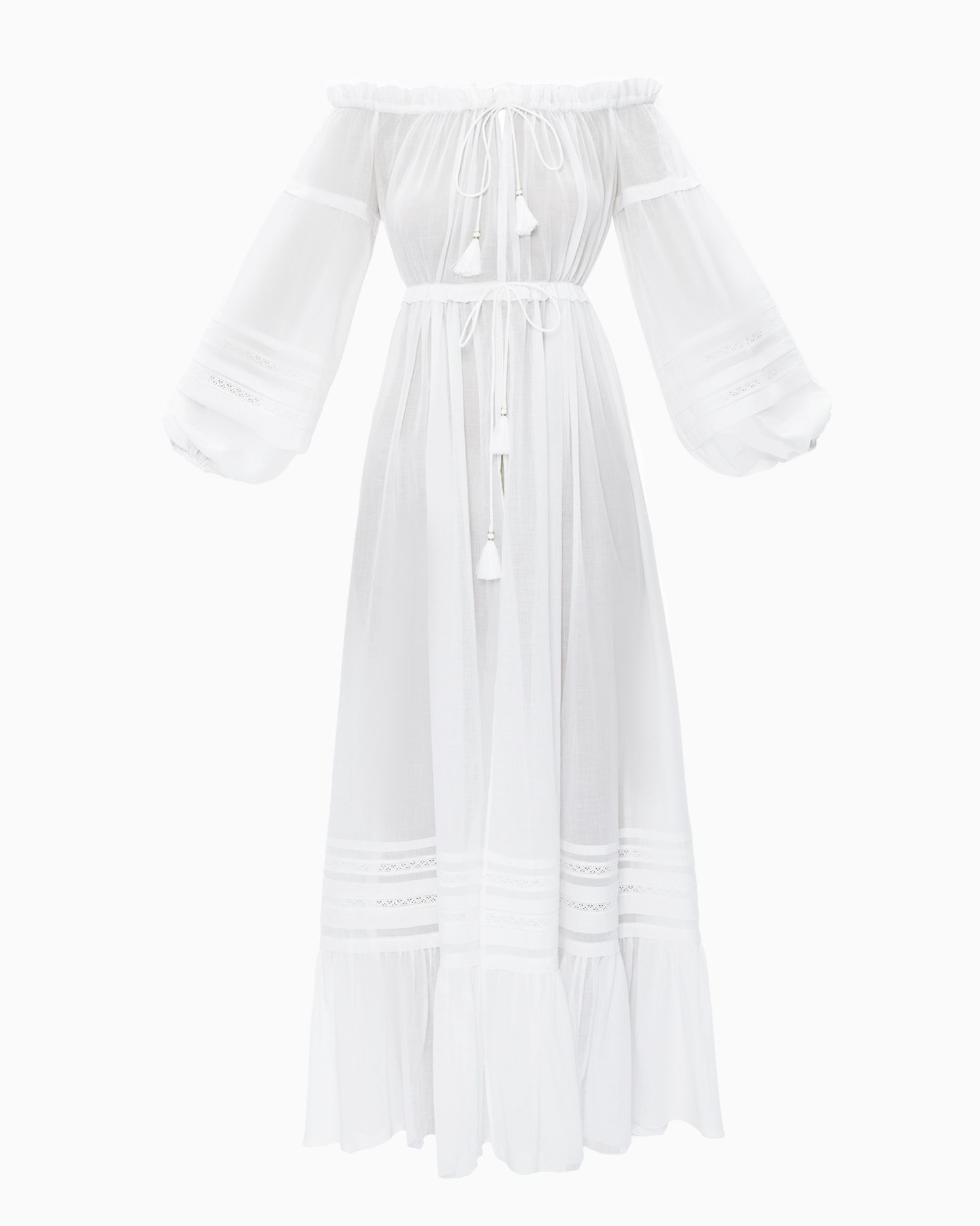 Идеальное платье для летнего отдыха на южном побережье Франции или Греции. Для похода на beach club или для пикников со шляпой и казаками. Вы даже можете выйти замуж на берегу моря и стать самой неотразимой невестой в этом изысканном платье из итальянского хлопка. Детали: завязочки и кисточки на талии, разрез спереди, кружевная тесьма ручной работы.